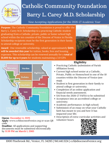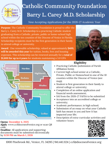 The Catholic Community Foundation of Southwest Florida is proudly offering the ” Barry L. Carey, M.D. Scholarship“, an academic scholarship made possible through the Catholic Legacy of Dr. Barry Carey and his loving family. Through the Carey’s generous gift to the Foundation, one renewable scholarship of approximately $400 will be available to a graduating senior from a Catholic school, private school, home school, or public school in the Diocese of Venice Counties who will be a first generation in their family to attend college or university.