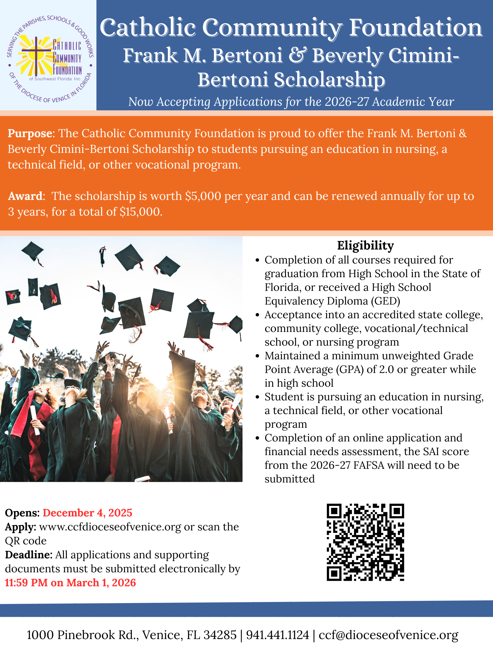 The Catholic Community Foundation is proud to offer the Frank M. Bertoni & Beverly Cimini-Bertoni Scholarship Fund to students pursuing an education in nursing, a technical field, or other vocational program.