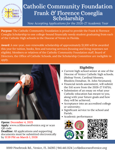 Thanks to the generosity and Catholic Legacy of Frank and Florence Coseglia, the Catholic Community Foundation of Southwest Florida proudly offers the “Coseglia Memorial Scholarship,” a one-time scholarship of approximately $1,100 to one college-bound, financially needy student graduating from each of the Catholic High Schools within the Diocese of Venice in Florida.