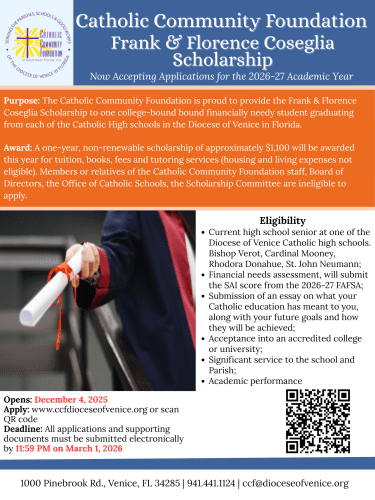 Thanks to the generosity and Catholic Legacy of Frank and Florence Coseglia, the Catholic Community Foundation of Southwest Florida proudly offers the “Coseglia Memorial Scholarship” a one time scholarship of approximately $1,100 to one college-bound financially needy student graduating from each of the Catholic High Schools within the Diocese of Venice in Florida.