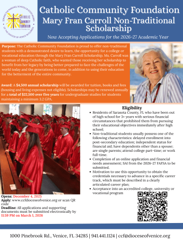 The Catholic Community Foundation of Southwest Florida is proudly offering the “Mary Fran Carroll Scholarship”, an academic scholarship made possible through the Catholic Legacy of Mary Fran Carroll. Through Ms. Carroll’s generous gift to the Foundation, academic scholarships of $4,500 each will be available to residents of Sarasota County, Florida. These educational opportunities will be open to adult learners who are returning to school to obtain a college degree or vocational certification after being out of high school for three or more years (non-traditional students). Mary Fran Carroll was a woman of deep Catholic faith, who wanted those receiving her scholarship to benefit from her legacy by being better prepared to face the challenges of the world today and the ages to come, in addition to using their education for the betterment of the entire community.