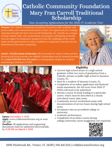 The Catholic Community Foundation of Southwest Florida is proudly offering the “Mary Fran Carroll Scholarship”, an academic scholarship made possible through the Catholic Legacy of Mary Fran Carroll. Through Ms. Carroll’s generous gift to the Foundation, academic scholarships of $4,500 each will be available to residents of Sarasota County, Florida. These educational opportunities will be open to graduating seniors and recent high school graduates (within the last two years) from Catholic, private or public high schools in Sarasota County, Florida who wish to pursue an undergraduate degree in any accredited college or university. Mary Fran Carroll was a woman of deep Catholic faith, who wanted those receiving her scholarship to benefit from her legacy by being better prepared to face the challenges of the world today and the ages to come, in addition to using their education for the betterment of the entire community.