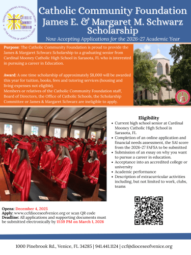 The Catholic Community Foundation of Southwest Florida is proudly offering the ” James E. & Margaret M. Schwarz Scholarship,” an academic scholarship made possible through the Catholic Legacy of Margaret M. Schwarz and her loving family. Through the Schwar’z generous gift to the Foundation, a one-time academic scholarship of approximately $8,000 will be available to a graduating senior from Cardinal Mooney Catholic High School in Sarasota, Florida who will be pursuing a career in education.